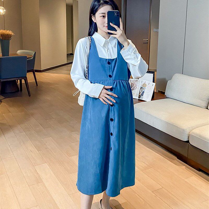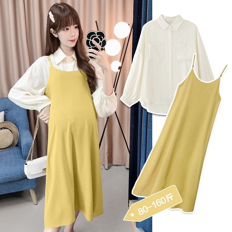 孕妇装春秋款套装网红时尚款衬衫上衣洋气减龄背带连衣裙外出春装