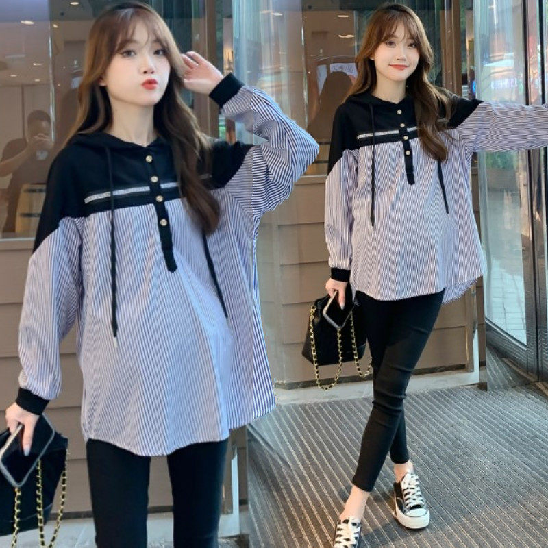 孕妇套装春秋新款时尚洋气时髦连帽条纹t恤女春装长袖上衣两件套