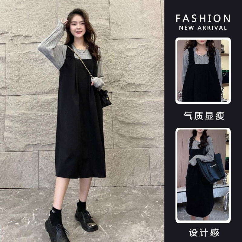 孕妇春秋连衣裙套装2025潮妈外出时尚款宽松背带裙春装上衣两件套