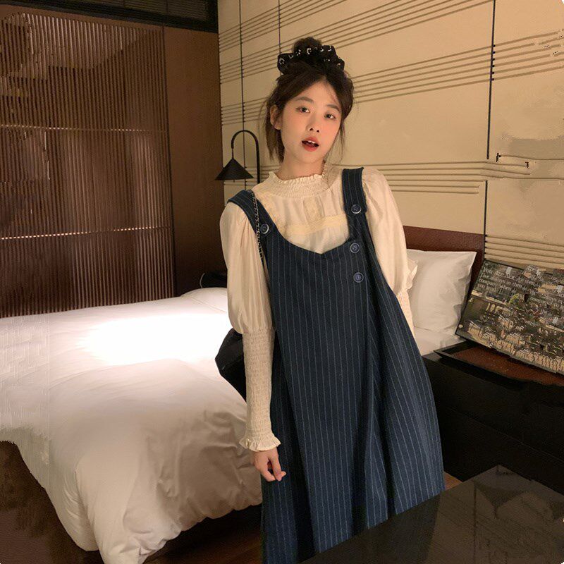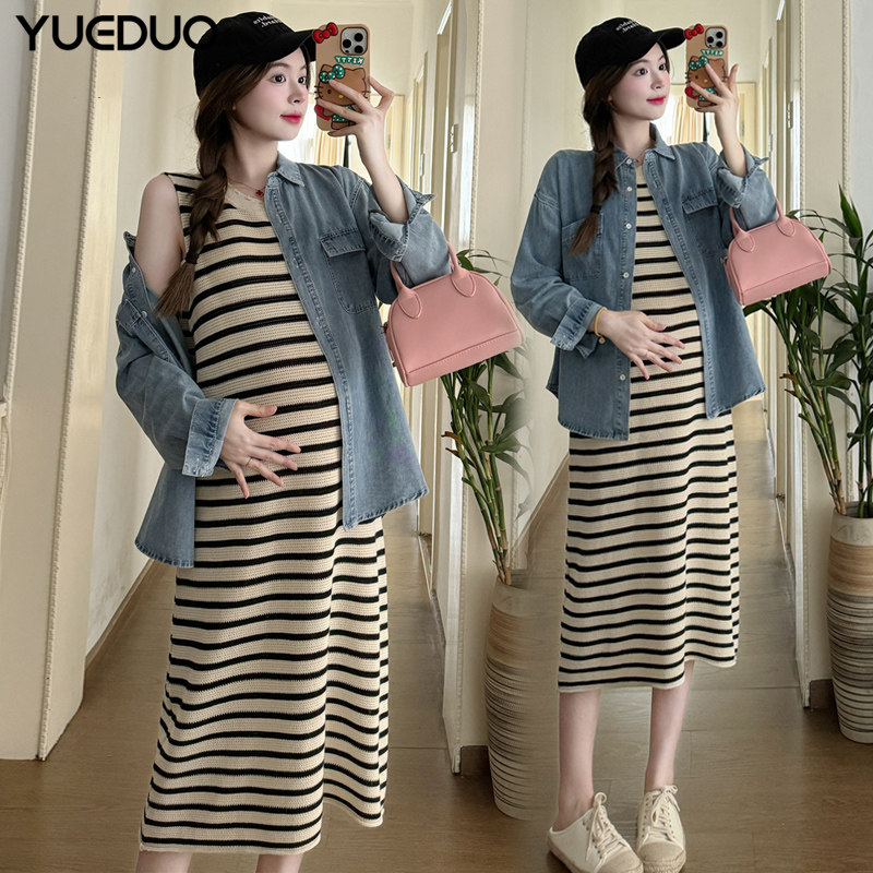 孕妇装小众春装套装2025年新款时尚背带裙宽松大码条纹衬衫蕾丝衫