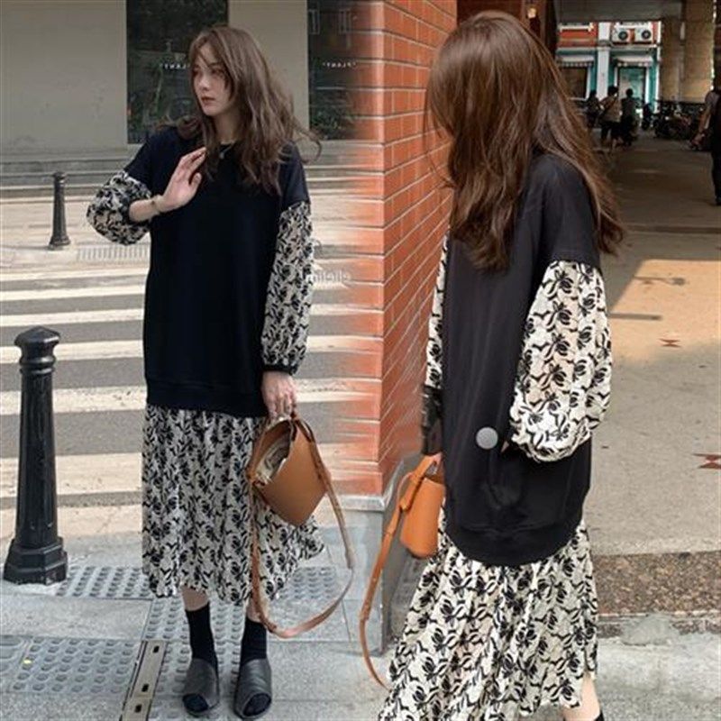 孕妇装春秋款时尚2023新款外出套装宽松中长款碎花拼接连衣裙春装