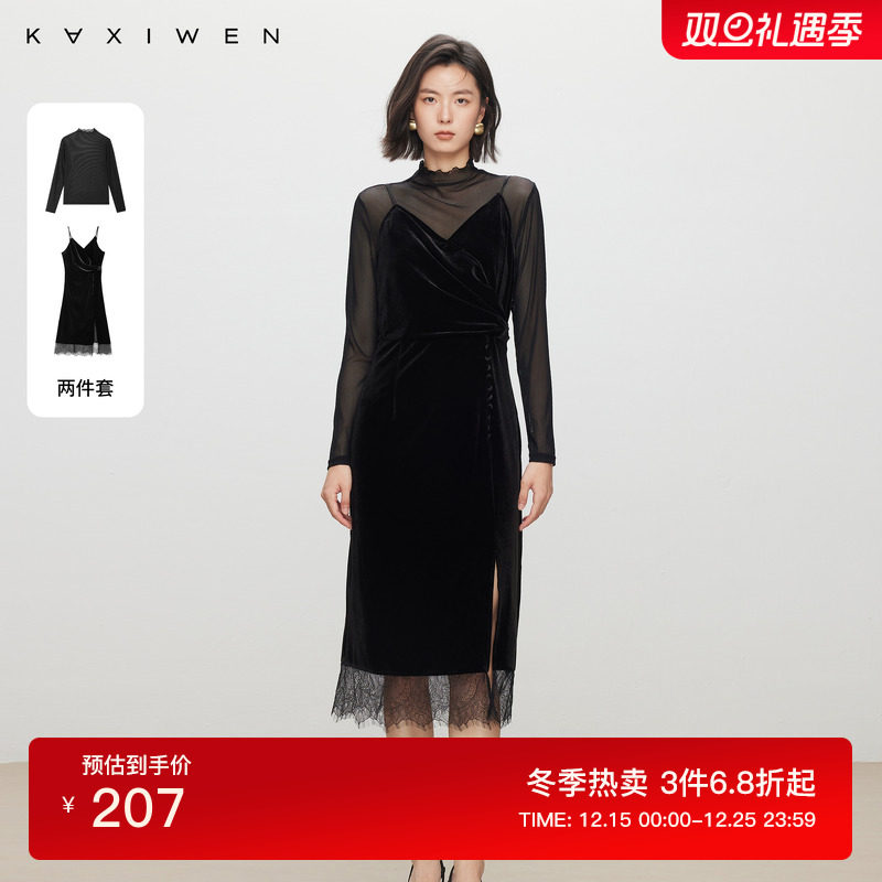 佧茜文优雅通勤丝绒连衣裙潮流秋季新款蕾丝网纱上衣吊带裙两件套