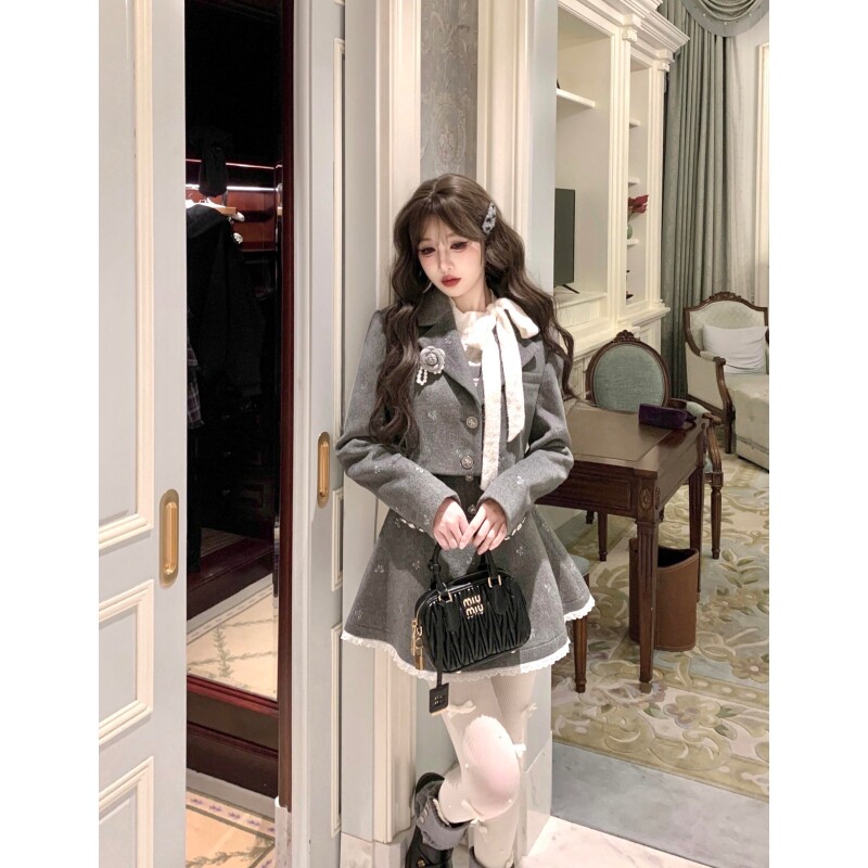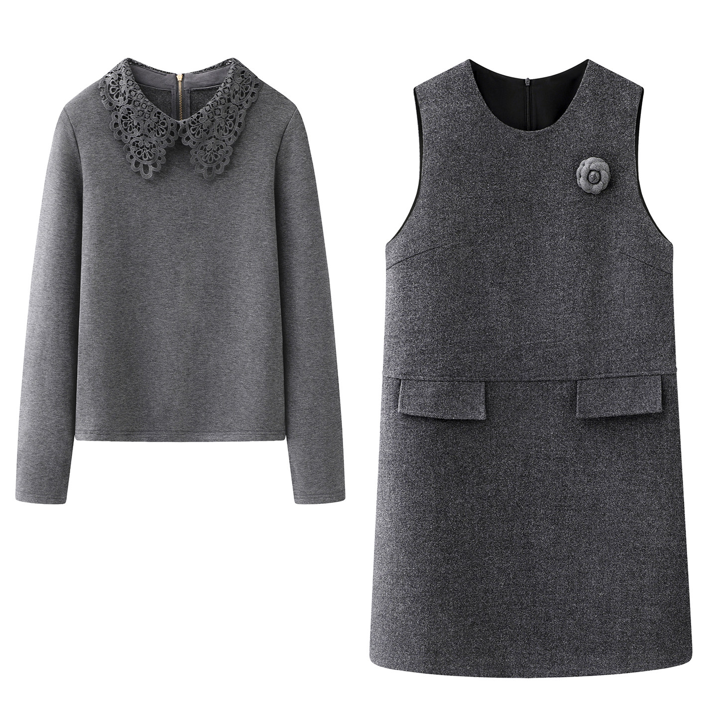 阔色灰色花苞连衣裙内搭蕾丝衬衫两件套装女25秋冬新款miu系穿搭