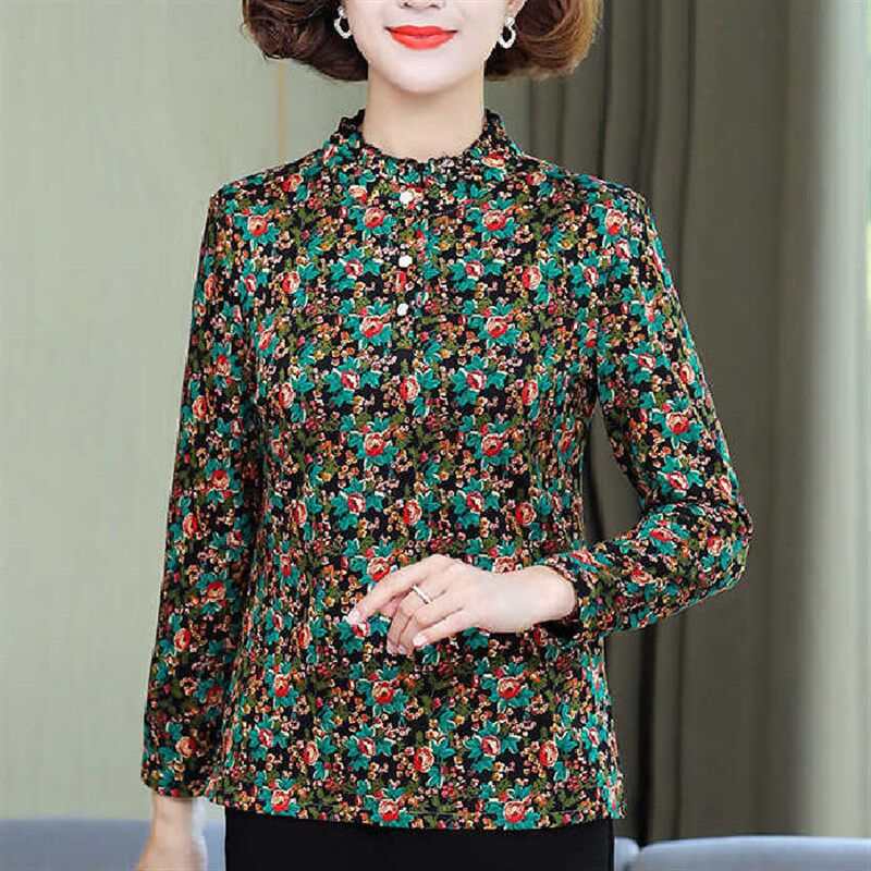 中老年大码女装春秋薄长袖立领小碎花打底衫内搭外穿两用T恤1825