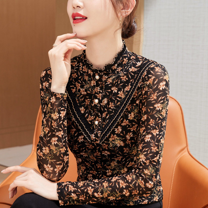 修身长袖t恤女春薄款木耳边高领碎花打底衫网纱叠穿内搭0225k