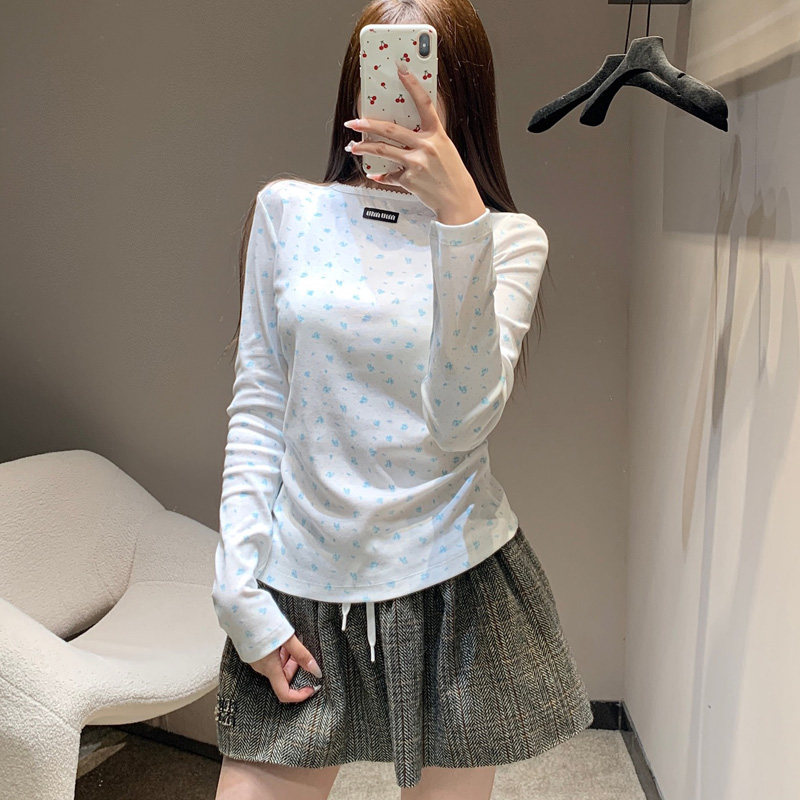 tingtings 白色印花修身长袖t恤女秋冬内搭纯棉碎花打底衫上衣