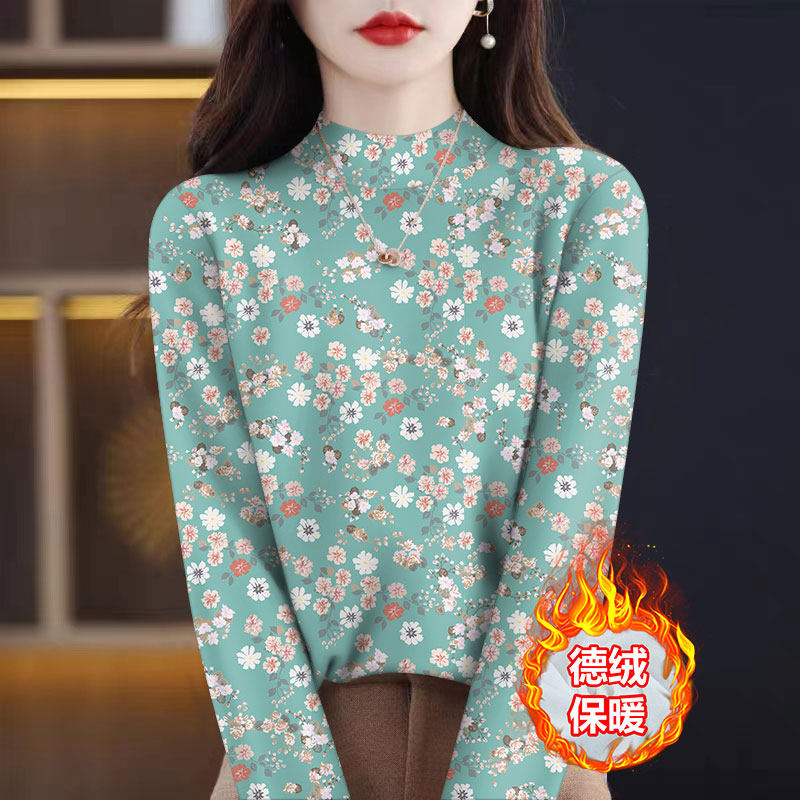 德绒新款妈妈装时尚半高领保暖长袖上衣秋冬碎花打底衫气质一体绒