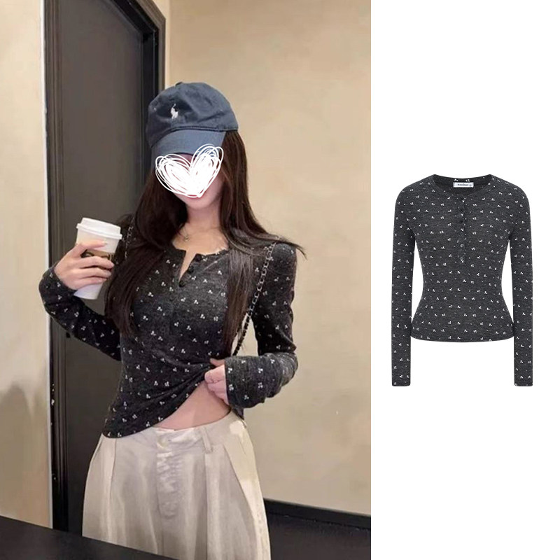 韩系灰色碎花长袖t恤女2026早春新款修身显瘦内搭绝美打底衫上衣