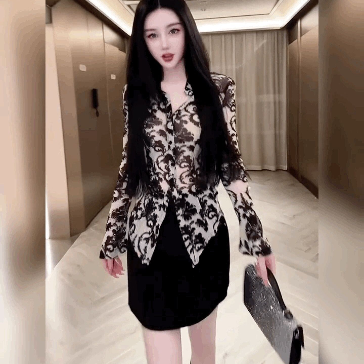 修身轻奢蕾丝网纱T恤衬衫女复古碎花打底衫POLO领单排扣法式上衣
