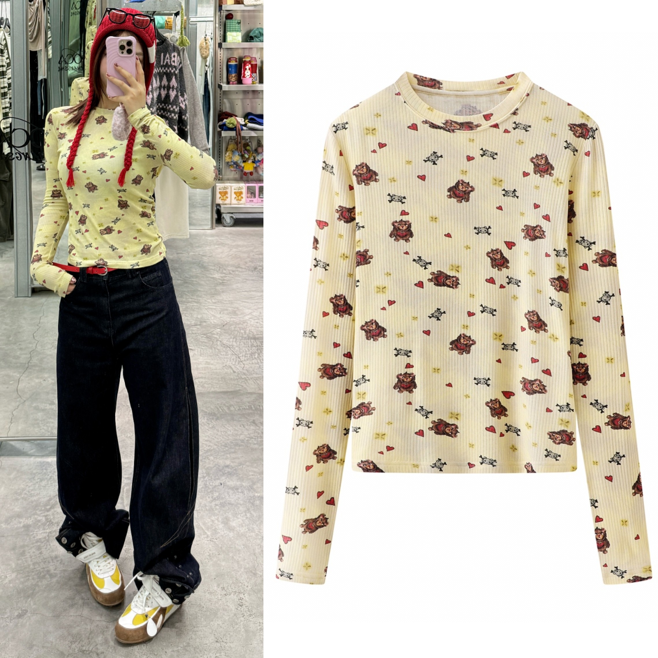 长袖T恤2026春夏新品少女心爆棚涂鸦感独角小熊爱心碎花打底衫