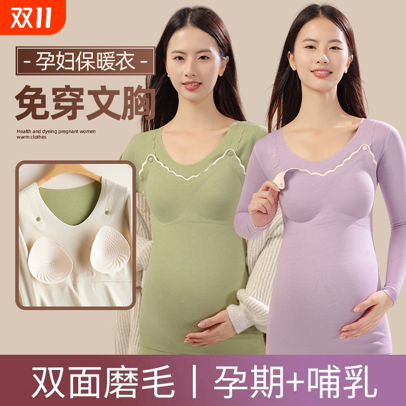 哺乳秋衣上衣纯棉德绒保暖内衣孕妇秋衣秋裤套装秋冬款喂奶带胸垫