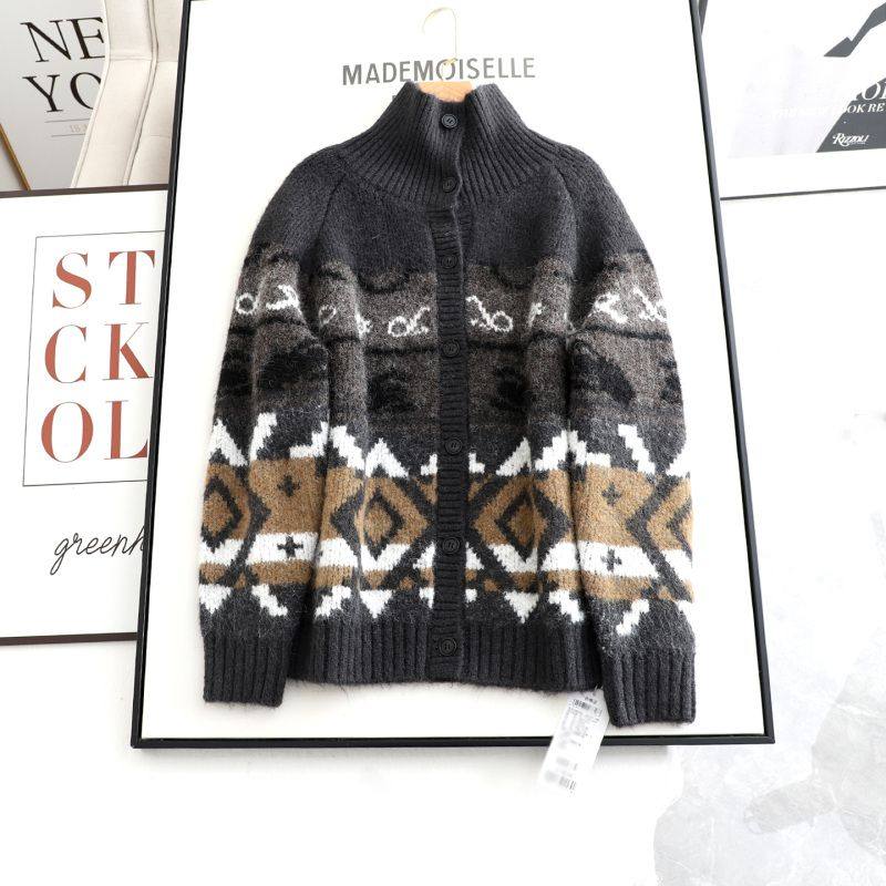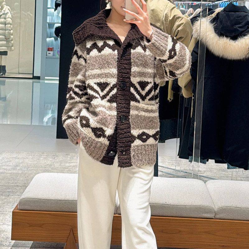 现货 秋冬复古提花针织开衫女翻领宽松外套慵懒风保暖毛衣M2081