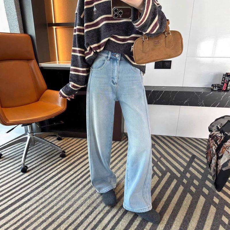 现货 小马毛巾绣加绒牛仔裤休闲显瘦厚实直筒阔腿裤拖地长裤女冬