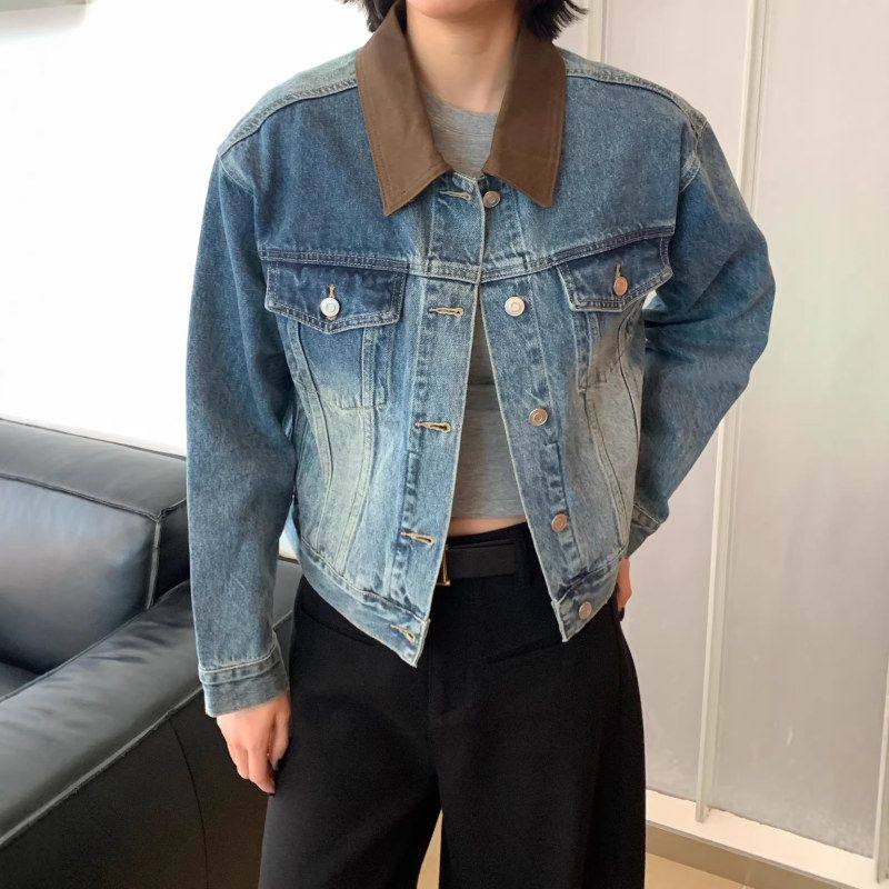 现货 牛仔外套女撞色翻领短款夹克做旧宽松休闲复古工装上衣春秋