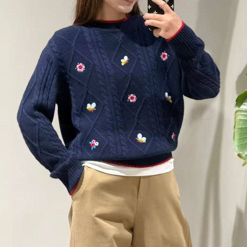 现货 藏青绞花针织毛衣女圆领刺绣宽松休闲长袖套头上衣秋冬H2098