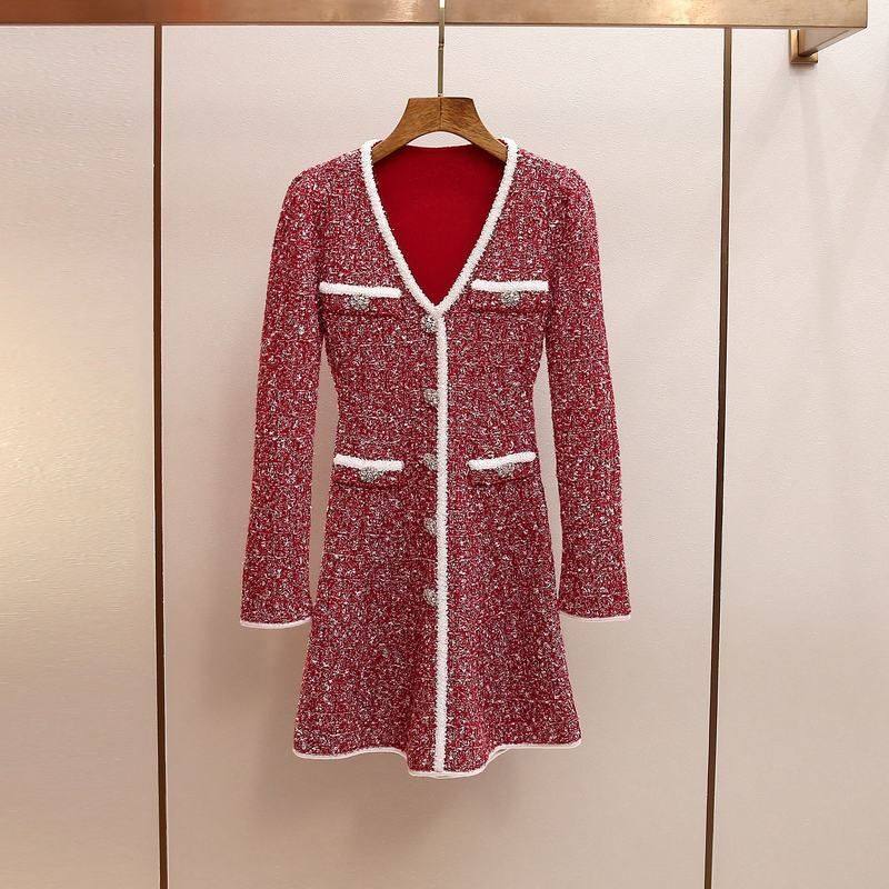 恋小维女装2025秋冬新款肌理设计感V领钻扣长袖显瘦针织连衣裙