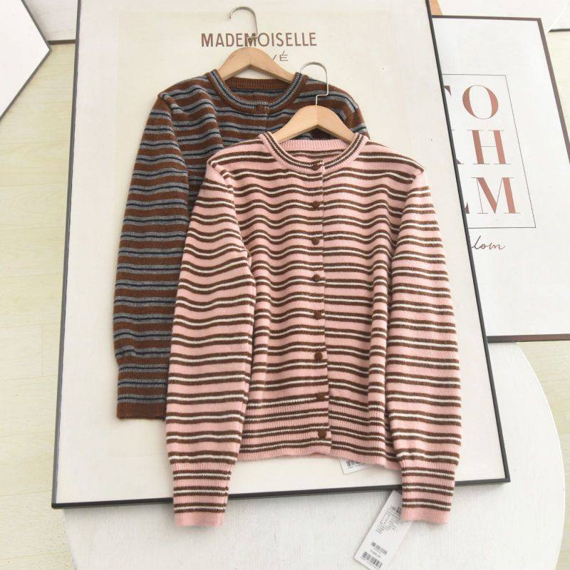 现货 复古红白条纹针织衫女宽松长袖刺绣慵懒风显瘦上衣冬季Y2105