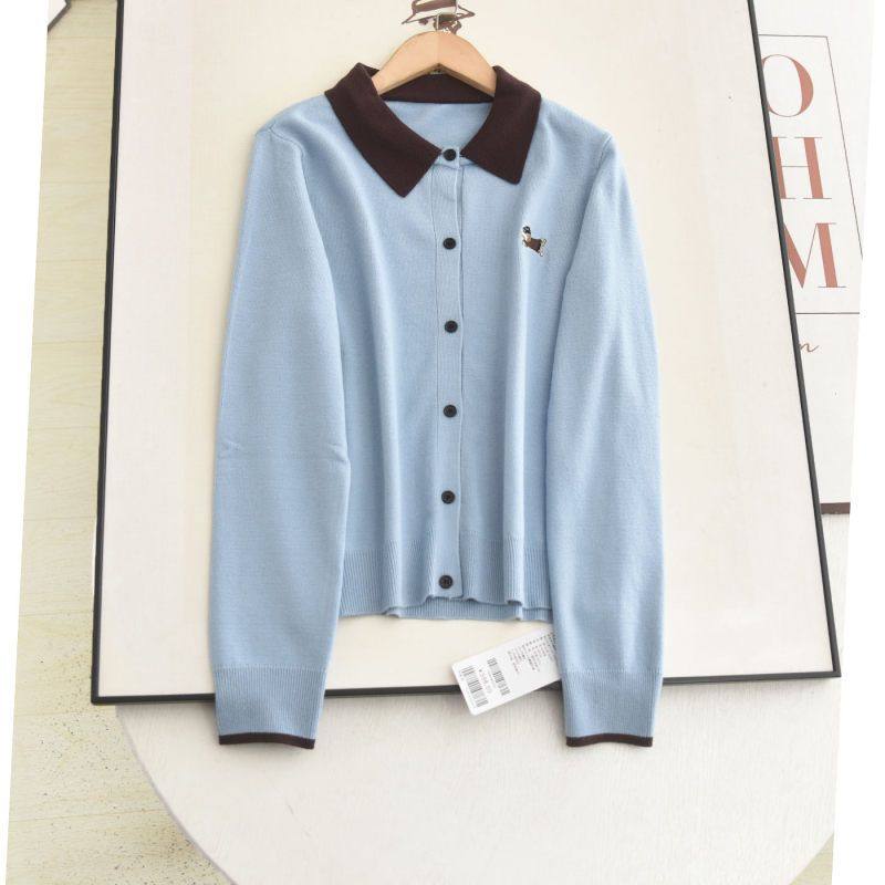 恋小维女装2025秋新款撞色翻领气质减龄蓝色针织开衫毛衣 女