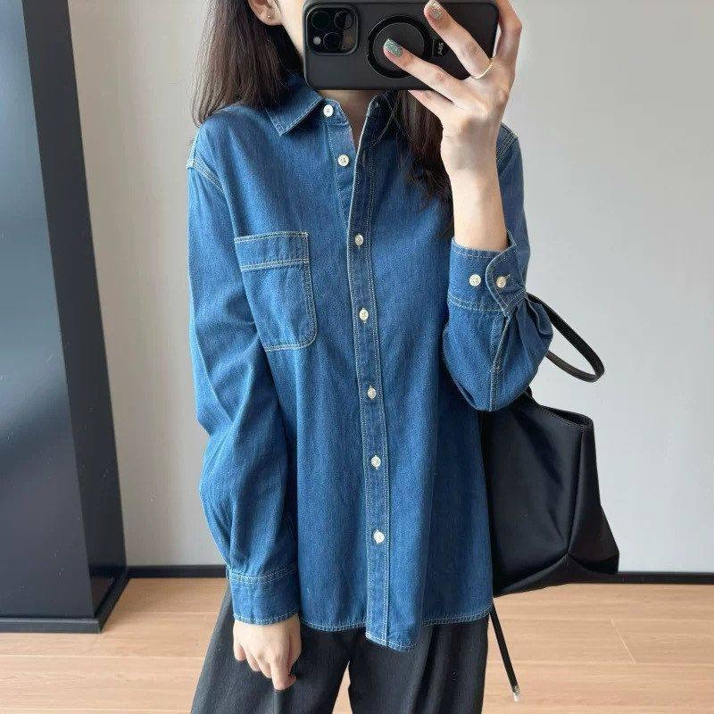 现货 软糯复古翻领单口袋休闲两色牛仔衬衫直筒长袖测开叉衬衣女