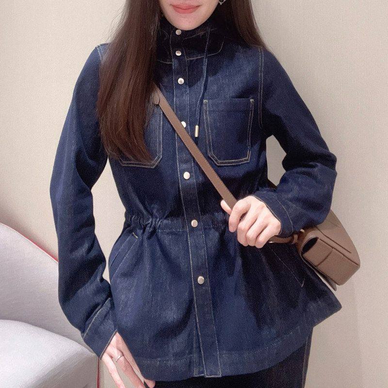 现货 藏青牛仔衬衫外套女连帽抽绳收腰设计感单排扣上衣春秋Y2114