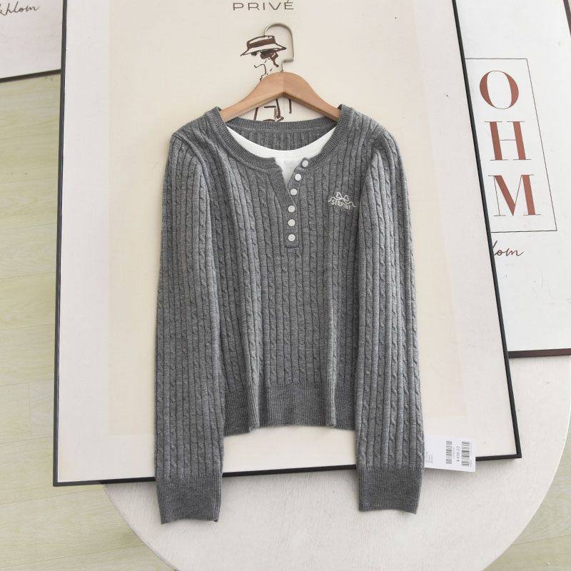 恋小维女装2025秋冬气质圆领拼接假两件显瘦灰色针织衫套头毛衣