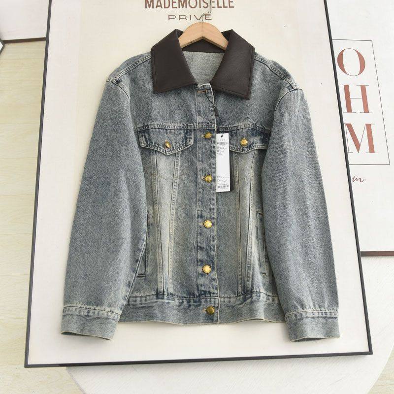 恋小维女装2025秋新款撞色拼接pu翻领设计休闲韩版宽松牛仔外套女