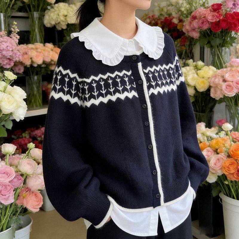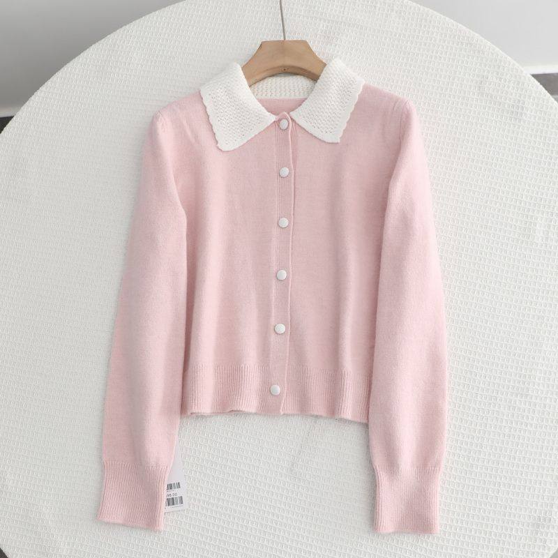 恋小维女装时尚娃娃领休闲针织衫开衫女2025秋季新款撞色减龄毛衣