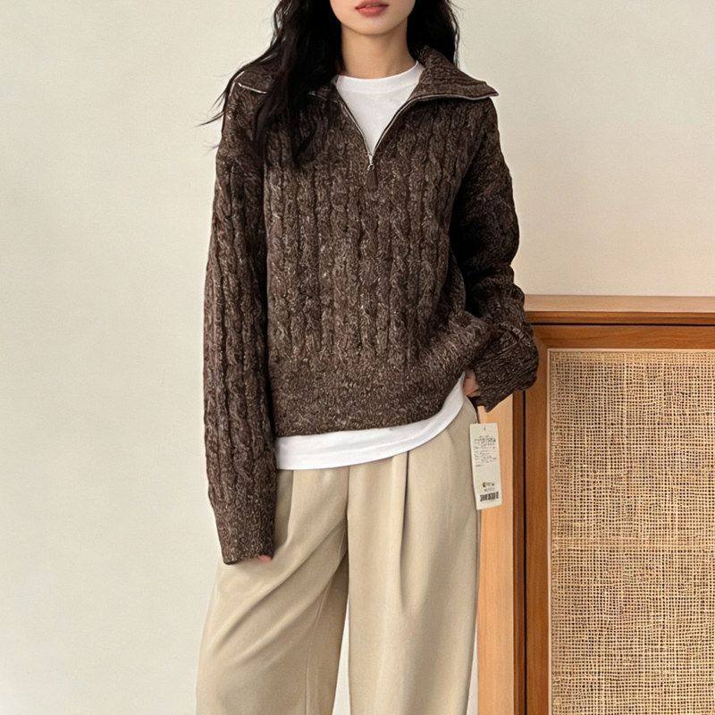 现货 复古半拉链翻领毛衣女宽松慵懒风套头长袖针织衫秋冬MM2115