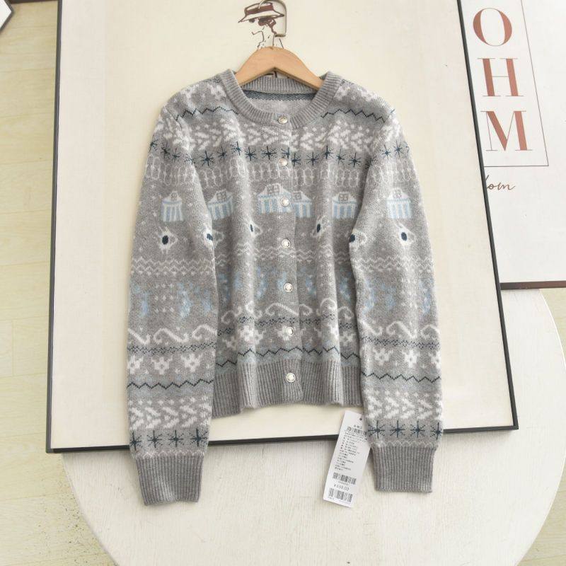 恋小维女装2025秋冬新款气质圆领费尔岛提花设计灰色针织开衫毛衣
