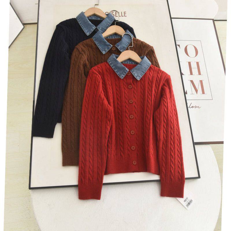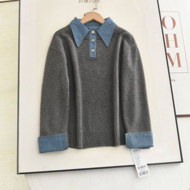 恋小维女装2025秋冬款设计牛仔拼接POLO领灰色假两件针织衫毛衣