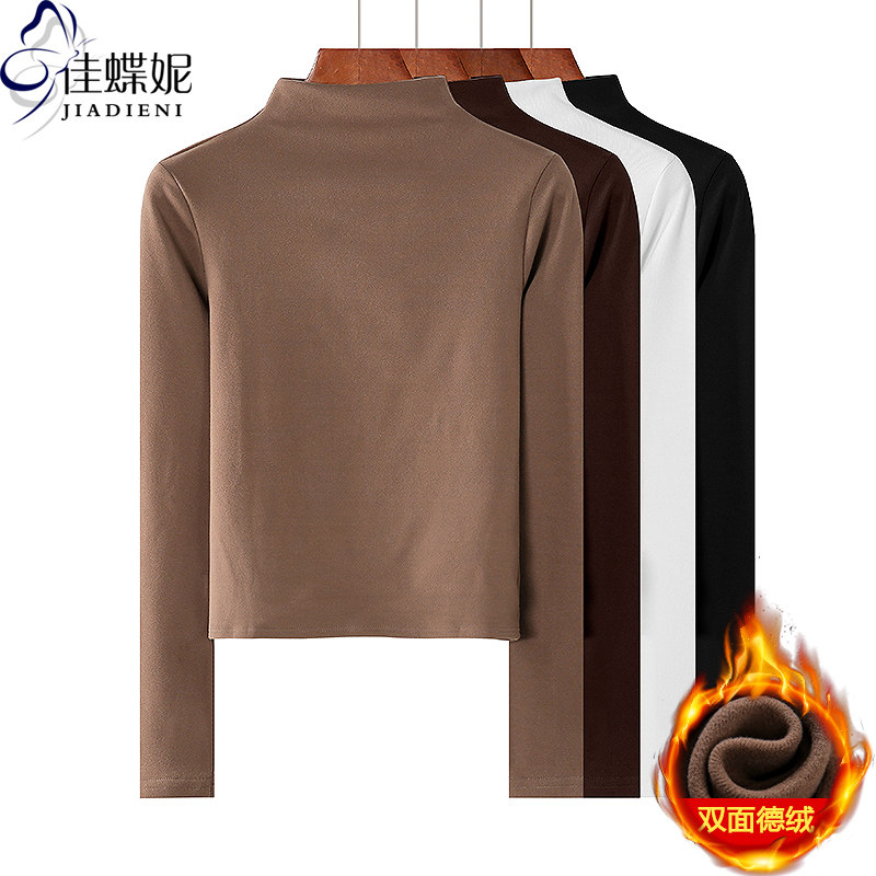 秋冬新款半高领修身短款纯欲纯色高腰德绒保暖长袖体恤上衣女打底