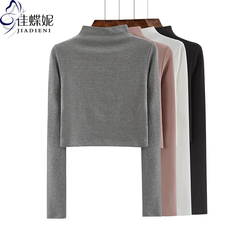 秋新款韩版纯白半高领修身高腰短款显瘦长袖体恤上衣内搭打底衫女