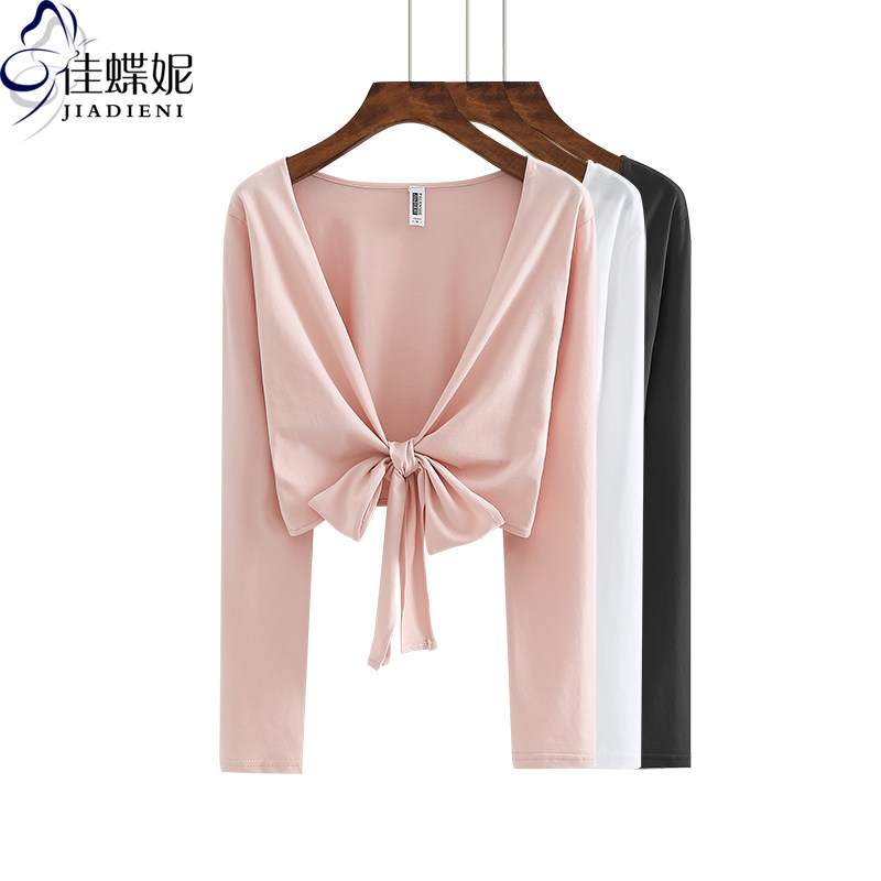 外贸方领系带挂脖长袖T恤衫春秋新款弹力短款显瘦体恤女上衣10223