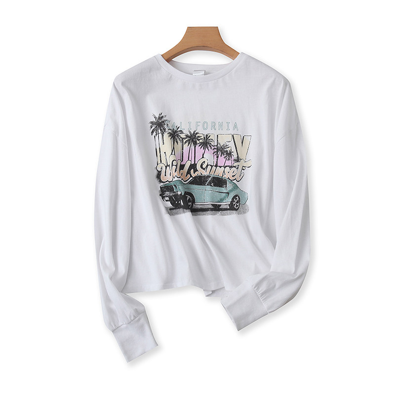 圆领印花T恤衫 春季新款长袖短款体恤 显瘦女打底衫宽松上衣O/4-4