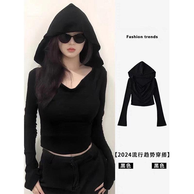 甜辣妹黑色连帽长袖t恤女秋季欧韩货高端上衣短款小个子紧身体恤