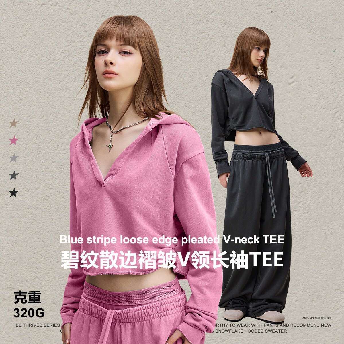 美式复古辣妹风V领褶皱短款帽衫体恤秋冬半开领散边连帽长袖T恤女