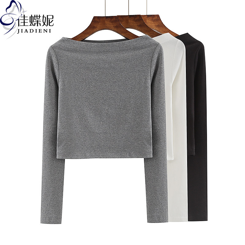 春秋新款韩版纯棉一字领修身长袖短款体恤内搭打底衫女装T恤露脐