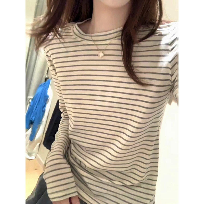 正肩圆领条纹长袖T恤女春秋内搭短款打底衫修身显瘦百搭体恤上衣