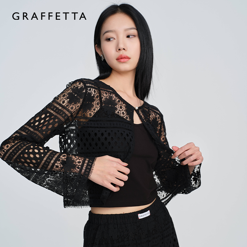 GRAFFETTA原创设计25春新款蕾丝长袖罩衫 夏季女短款黑色浮雕纹理