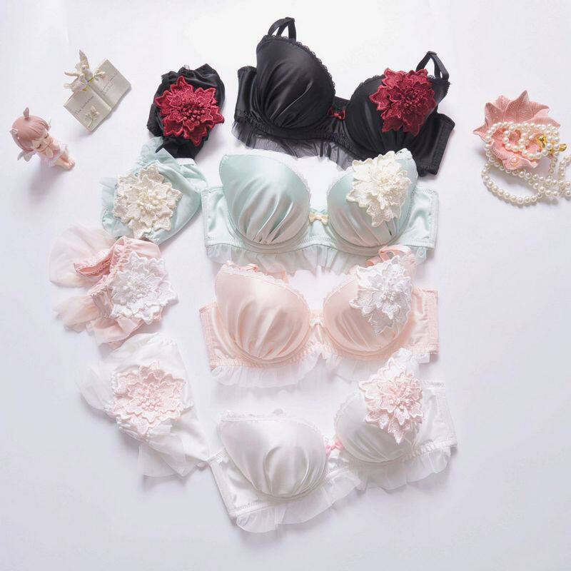 色丁刺绣小可爱清新日系内衣无海绵薄罩杯大花少女文胸套装有大码