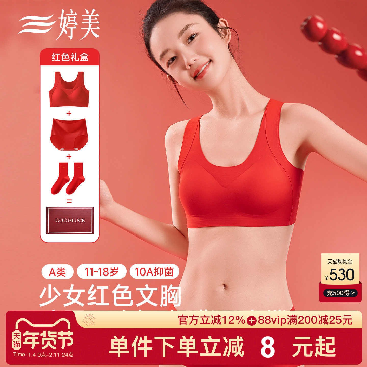 婷美新款红色少女文胸套装发育期运动防震不跑杯挺背无痕女孩内衣