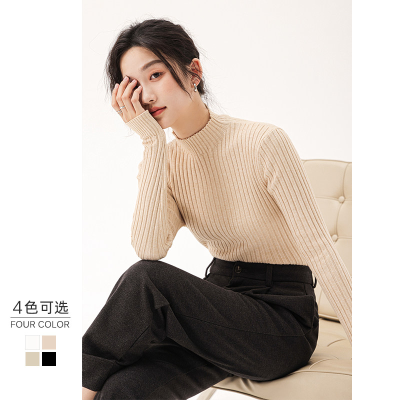 2023秋冬新款半高领螺纹打底衫女韩版紧身针织衫内搭毛衣黑色上衣