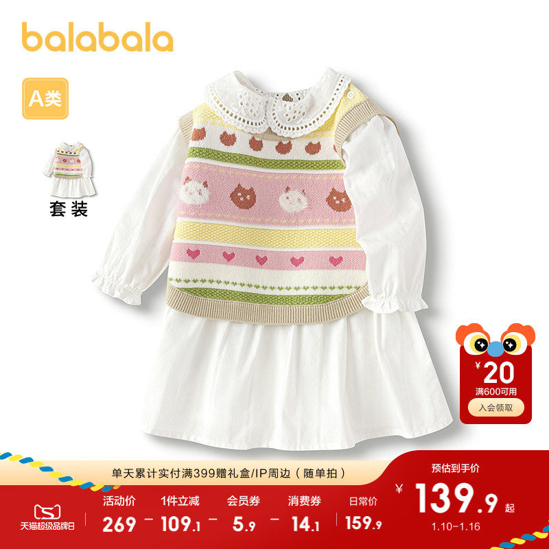 巴拉巴拉童装儿童连衣裙套装针织背心女童春秋衬衣裙两件套洋气甜