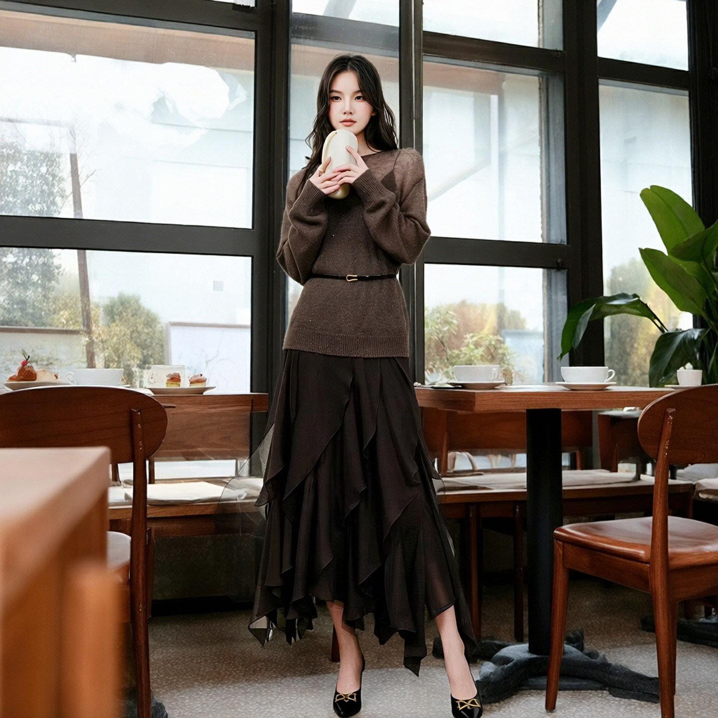 冬季套装连衣裙气质荷叶边上衣+高腰显瘦百搭半身长裙针织两件套
