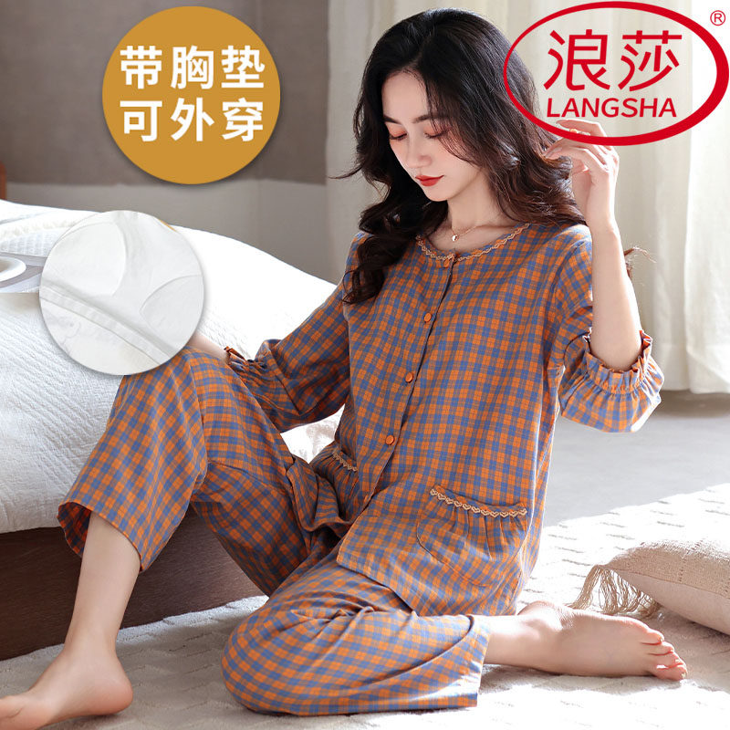 睡衣女款春秋2026新款纯棉长袖夏季带胸垫全棉布料女士家居服套装