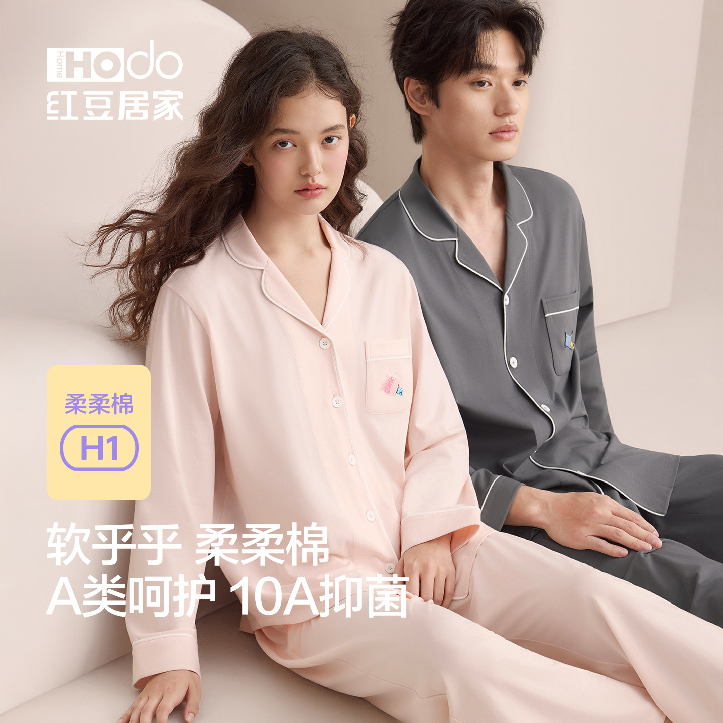 A类抗菌防螨纯棉情侣睡衣女长袖红豆带胸垫家居服套装男春夏薄款