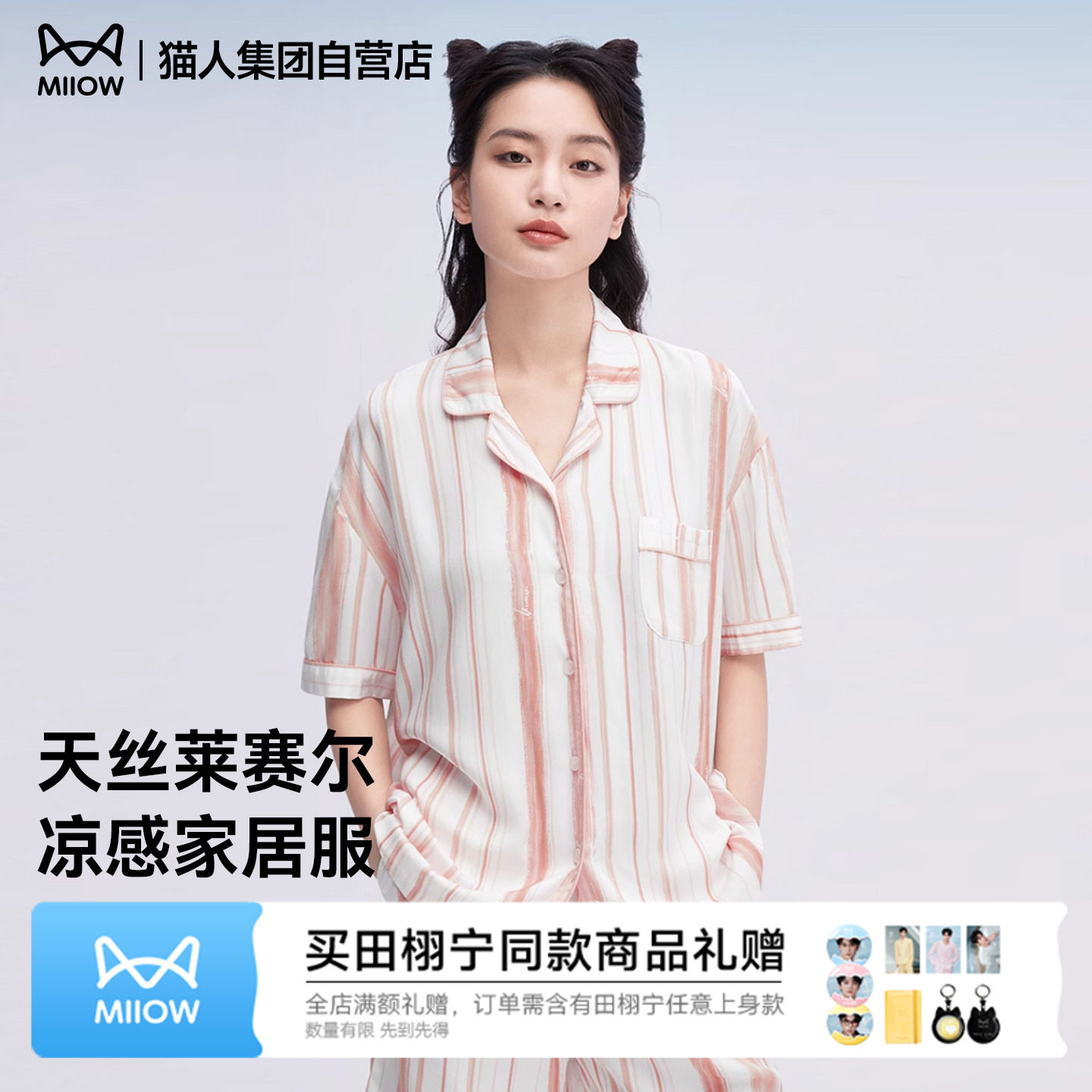 猫人竖条纹家居服凉感冰丝睡衣2026新款套装女款男春夏款睡衣短袖