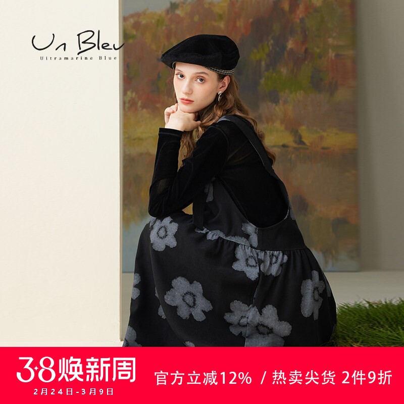 UnBleu黑色背带裙春秋季新款宽松背心连衣裙女装印花美拉德裙子