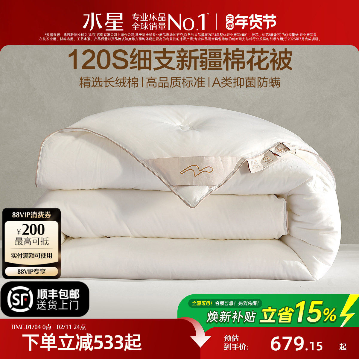 水星家纺120支高端棉花被子长绒棉A类抑菌四季被冬被保暖被芯送礼