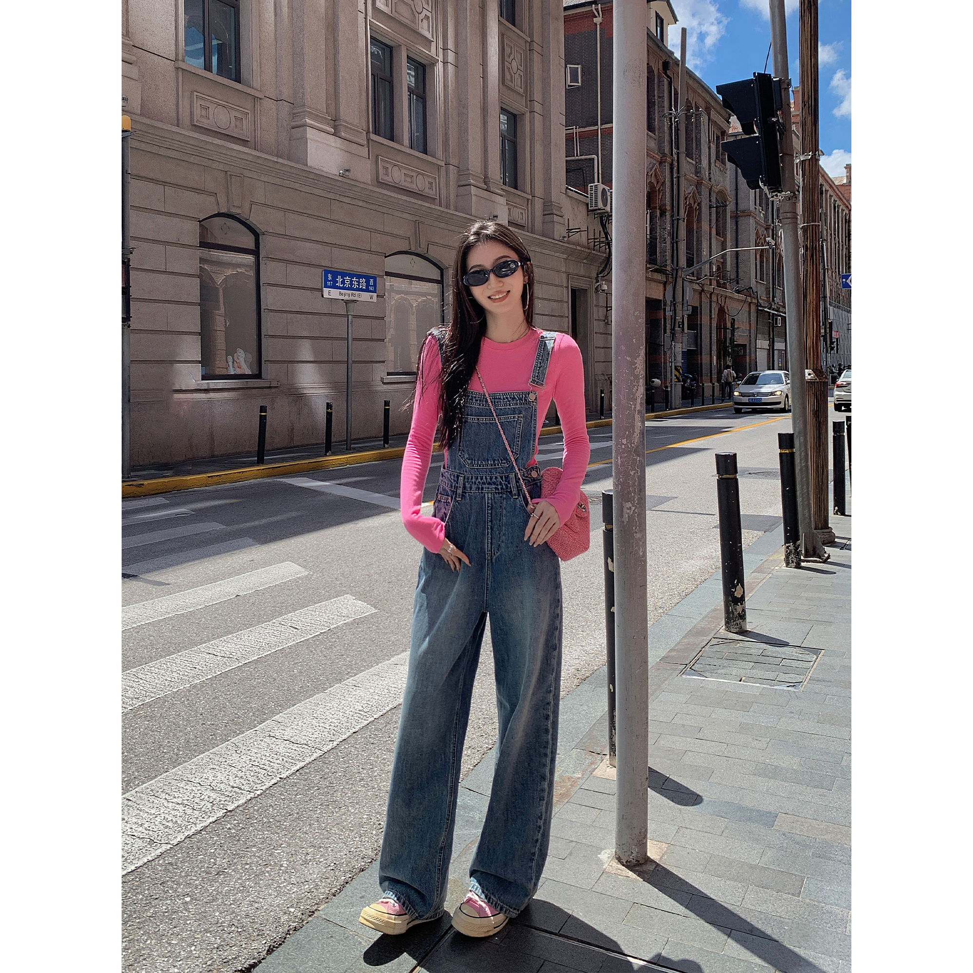 甜酷树莓粉色牛仔背带裤女春夏新款多巴胺穿搭直筒阔腿拖地连体裤